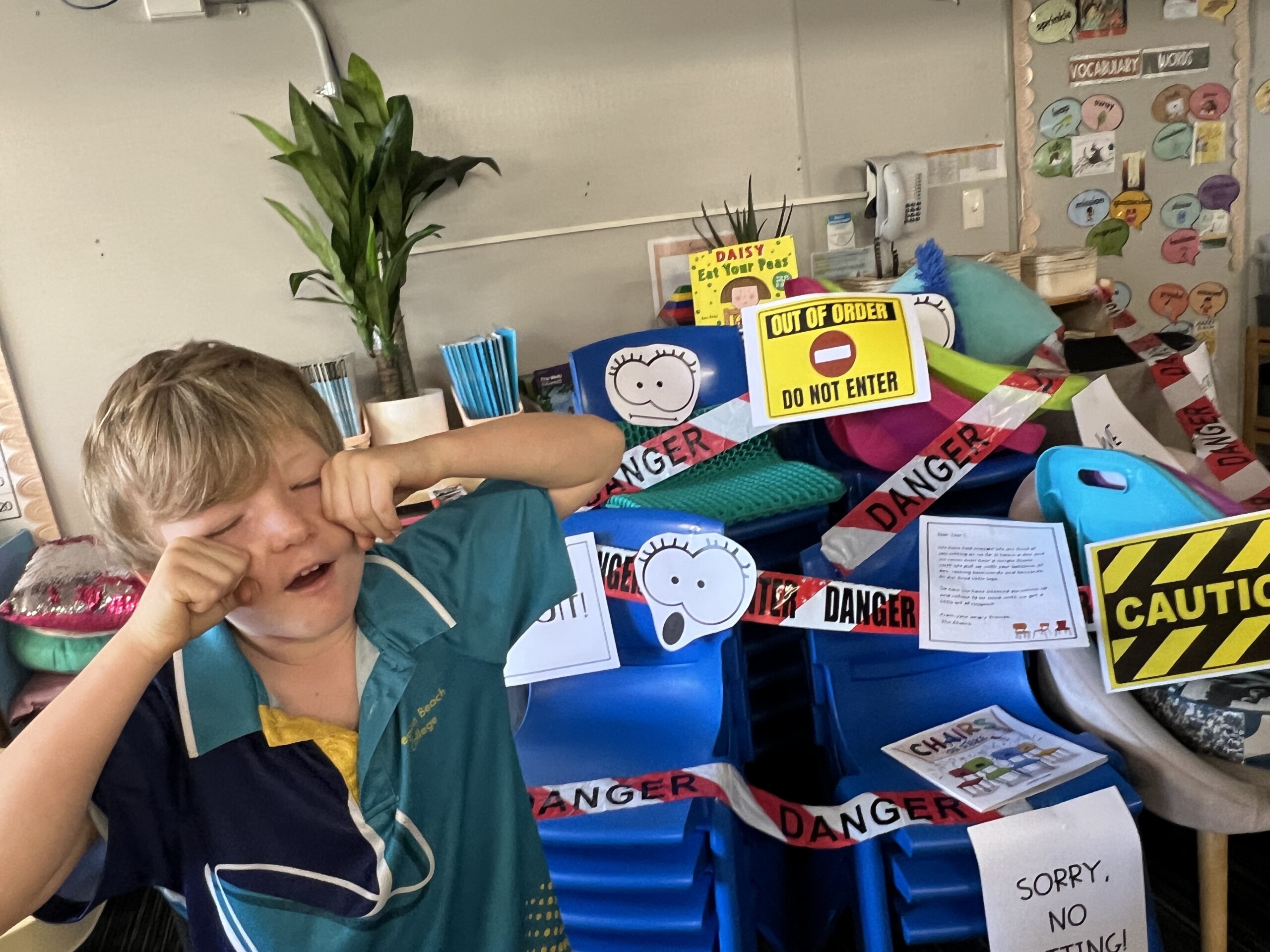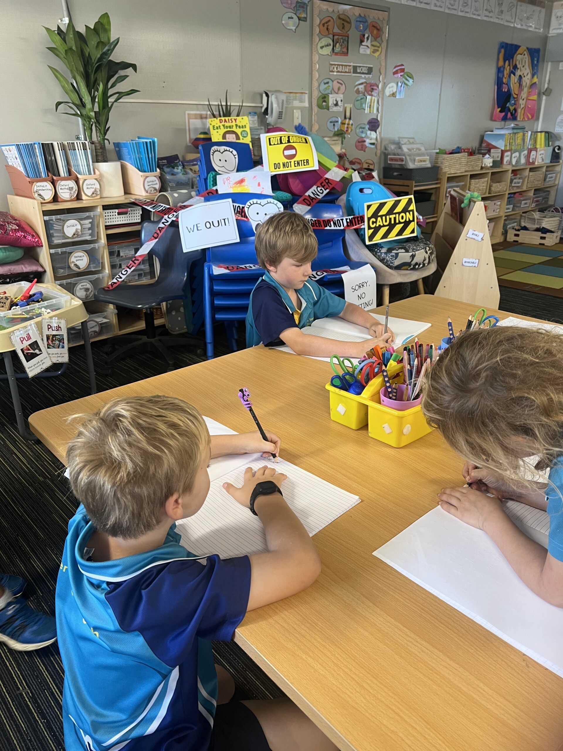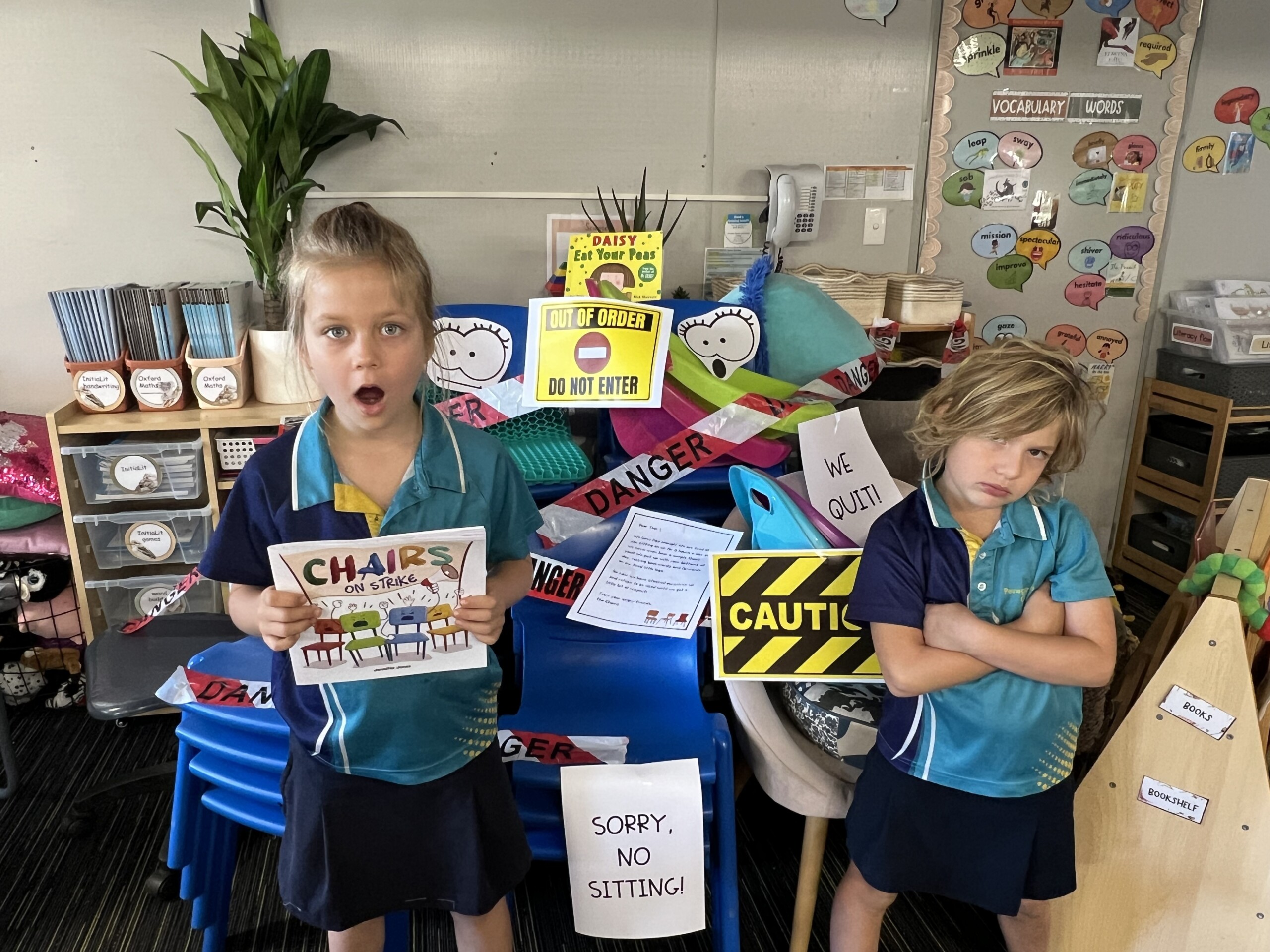 There was chaos in Year 1.2 this week when the classroom chairs went on strike! The children arrived to find all the chairs piled in the corner with signs saying, ‘WE QUIT!’.