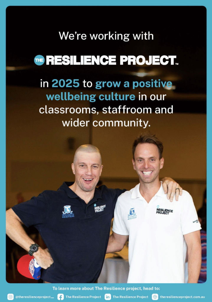 The Resilience Project is implemented within our secondary school. The program supports our students to build and maintain social and emotional skills and strategies, and enhance resilience. It is designed to promote positive mental health strategies, improve mental health and resilience and increase positive affect and wellbeing.